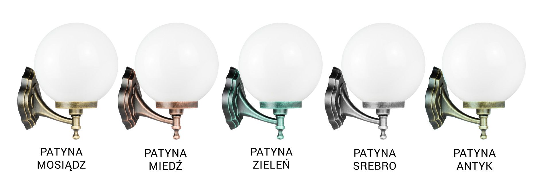 The lamp can be customized in six color variants: the basic black, and patina finishes of gold, silver, copper, green, and antique (with patinas additionally protected by high-quality clear lacquer).