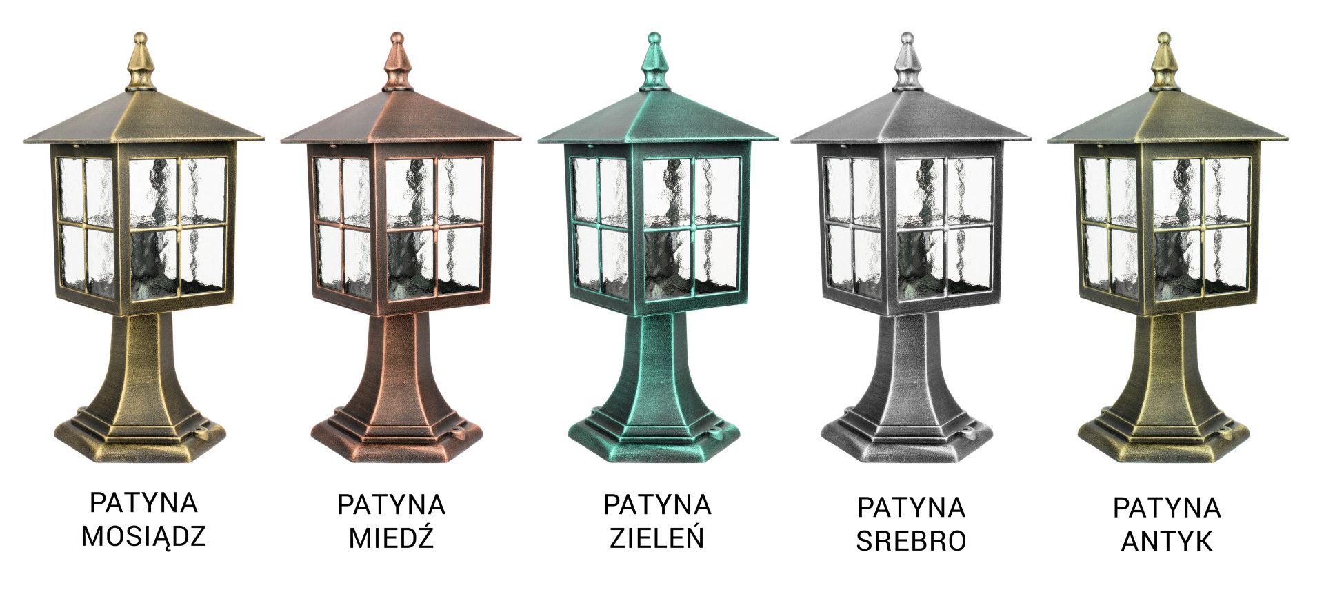 The lamp is available in six color variants: basic black and patinas in shades of brass, silver, copper, green, and antique. The patinas are additionally secured with a clear lacquer, ensuring their resistance to atmospheric conditions.