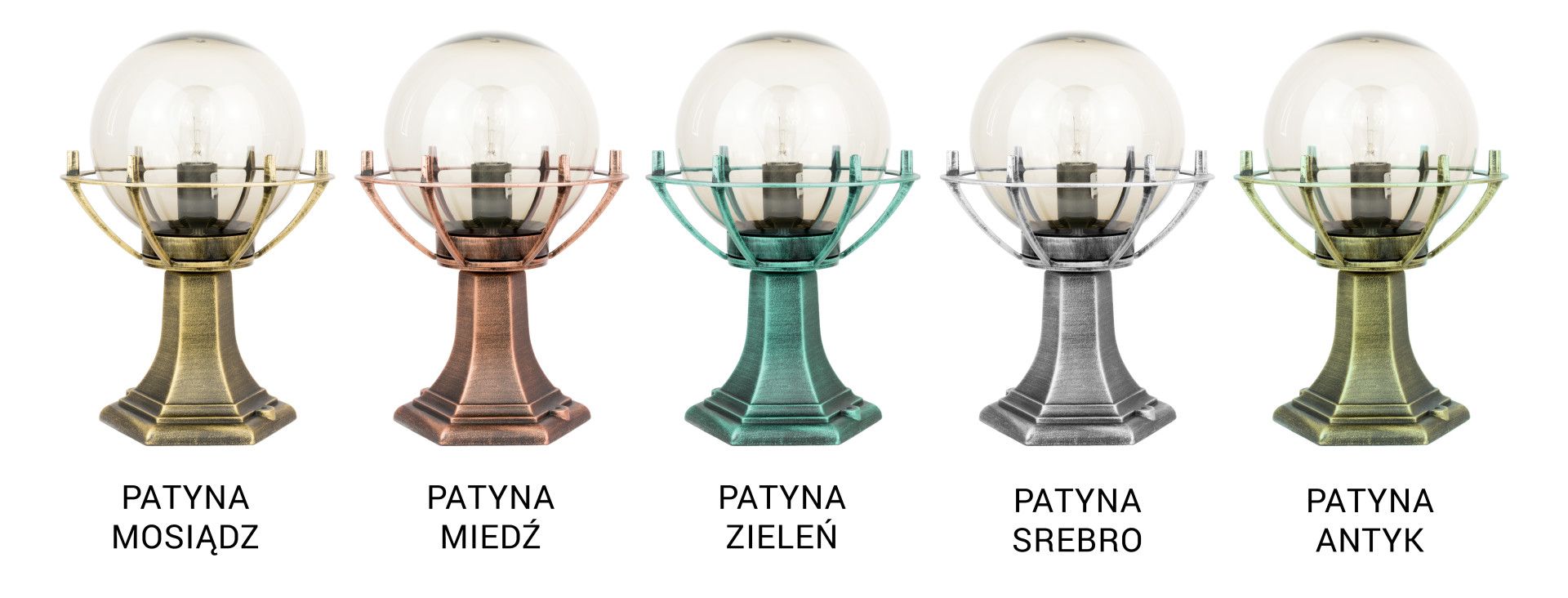 The lamp's basic black color can be complemented with decorative coatings in the following colors: gold, copper, silver, green, and antique, all of which are protected with high-quality clear lacquer.