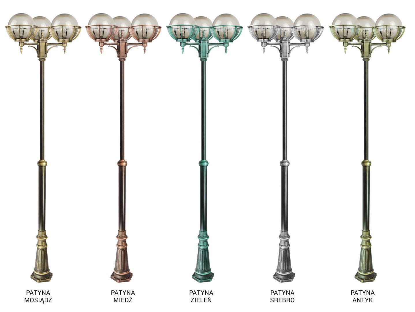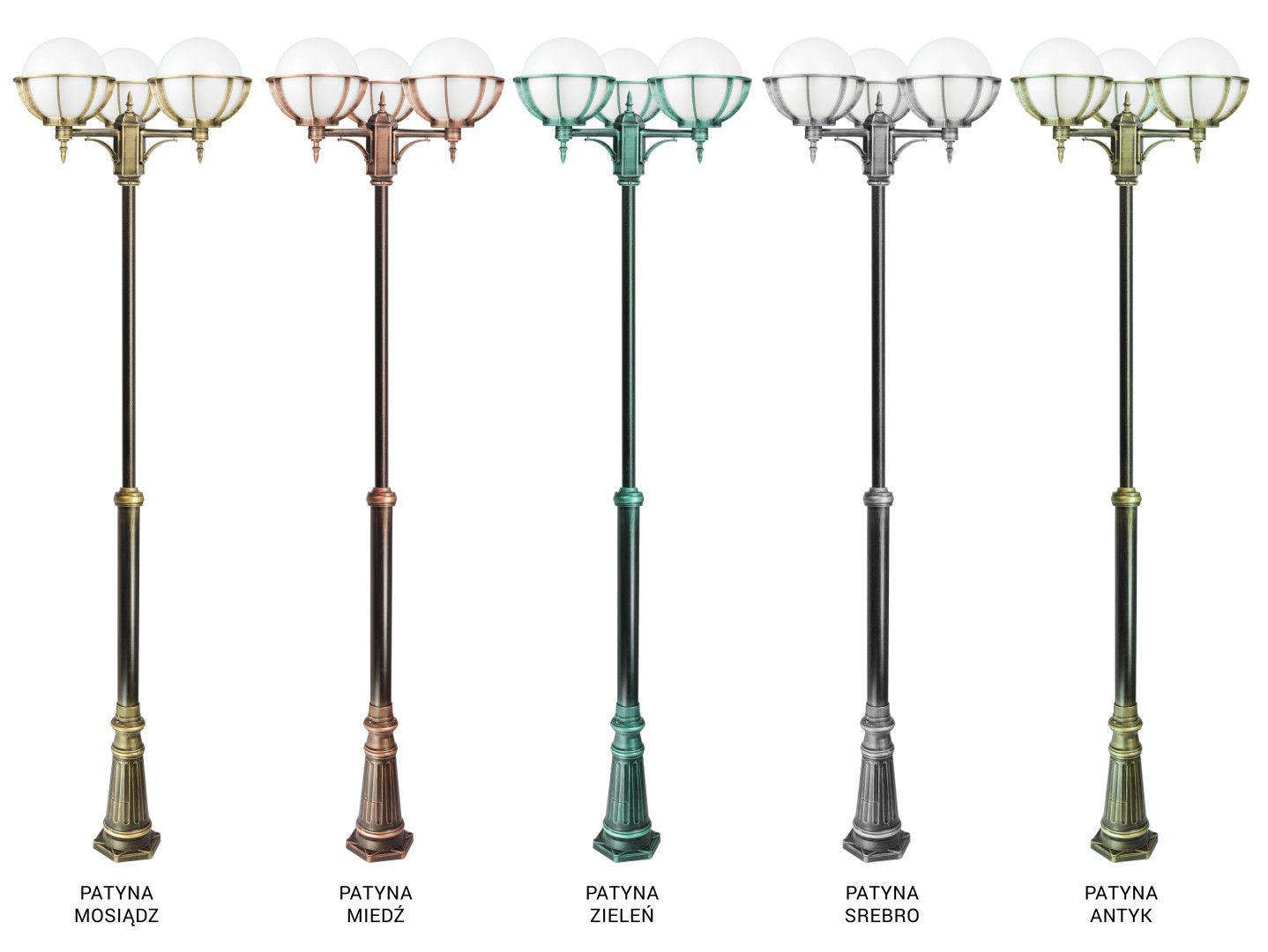 The OGMWN 3 KPO 250 post-mounted fixture is available in six color variants, including basic black and patinas: gold, silver, copper, green, and antique, all protected with high-quality clear lacquer.