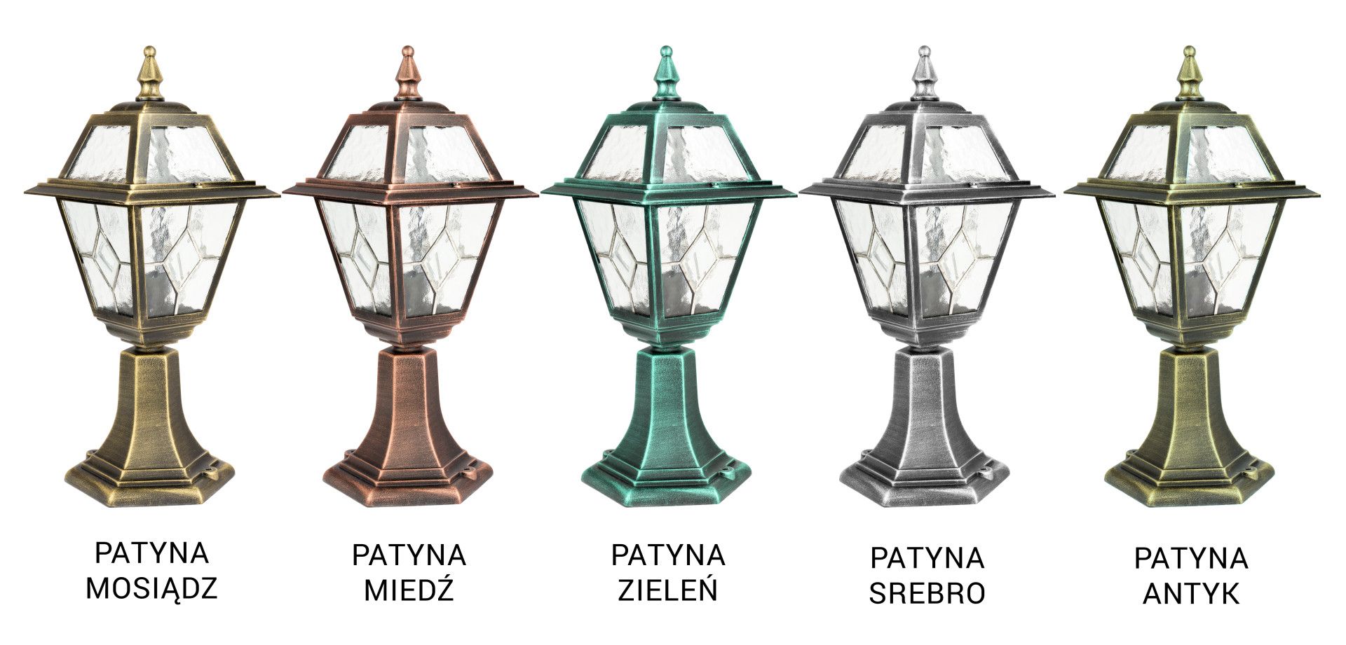 The Witraż series offers a wide range of options, including a hanging lamp, wall sconce, and standing lamps in four different heights: 47 cm, 80 cm, 110 cm, and 160 cm, allowing for a cohesive and stylish lighting scheme in various parts of the exterior environment.