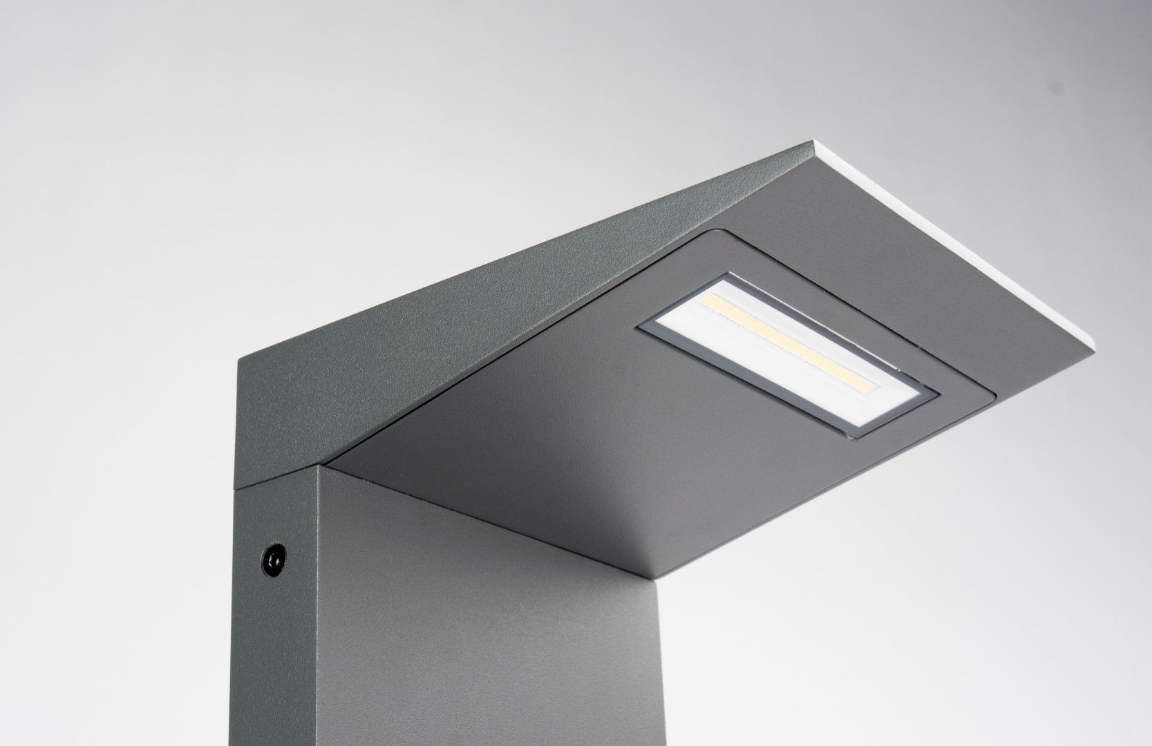 Lampa charakteryzuje się prostą, geometryczną formą, która doskonale wpisuje się w nowoczesne trendy architektoniczne. Korpus wykonany z wysokiej jakości aluminium w eleganckim kolorze ciemnego popielu zapewnia nie tylko szlachetny wygląd, ale również wyjątkową odporność na korozję i zmienne warunki atmosferyczne. Całość dopełnia klosz z przezroczystego szkła, który w pełni eksponuje strumień światła.