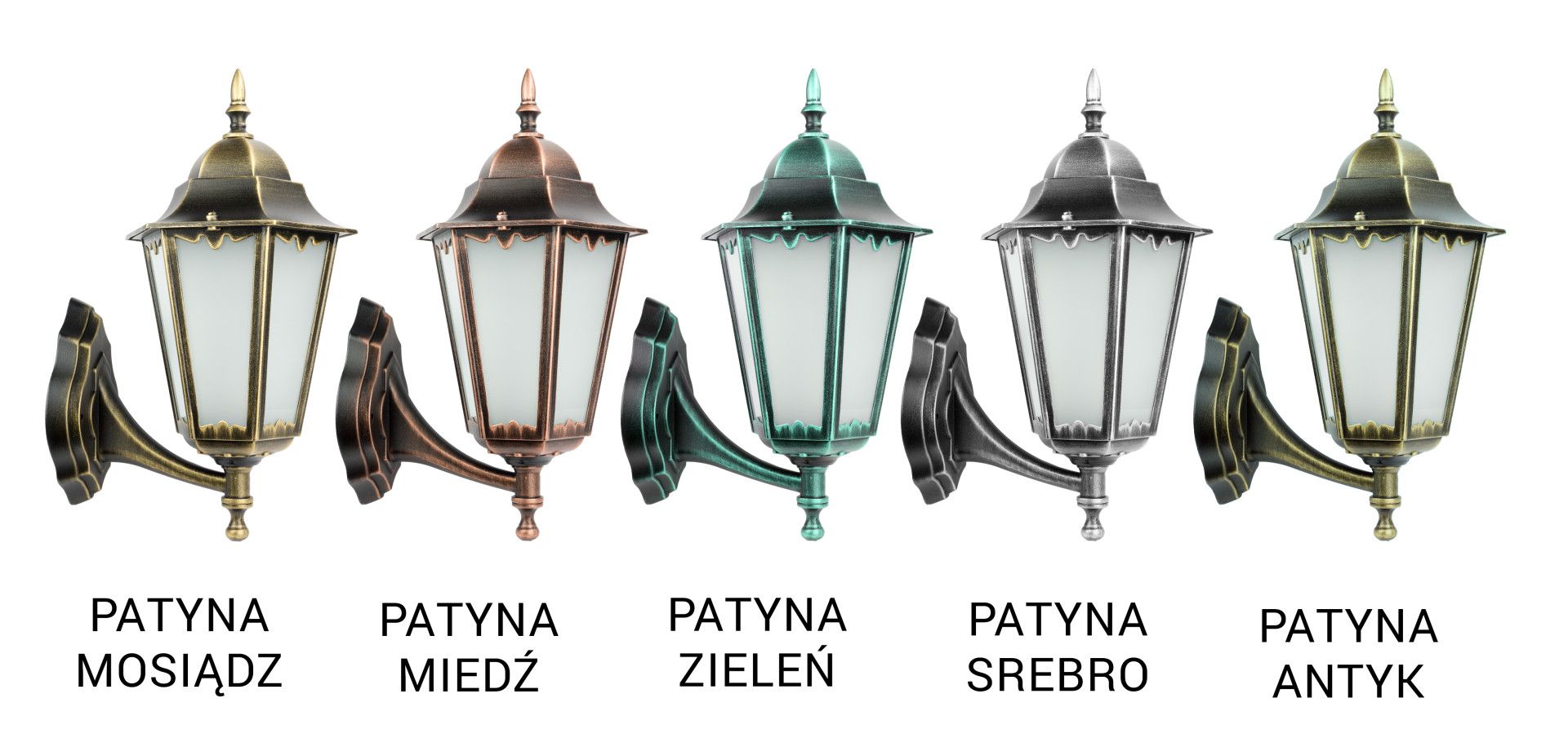 Kinkiet dostępny jest w sześciu wariantach kolorystycznych: klasycznym czarnym oraz patynach: mosiądz, srebro, miedź, zieleń i antyk. Patynowane wersje są dodatkowo zabezpieczone wysokiej jakości lakierem bezbarwnym, co zapewnia im dodatkową ochronę i trwałość. Dzięki szerokiej gamie kolorystycznej, kinkiet może być łatwo dopasowany do indywidualnych preferencji i stylu otoczenia, dodając mu unikalnego charakteru.