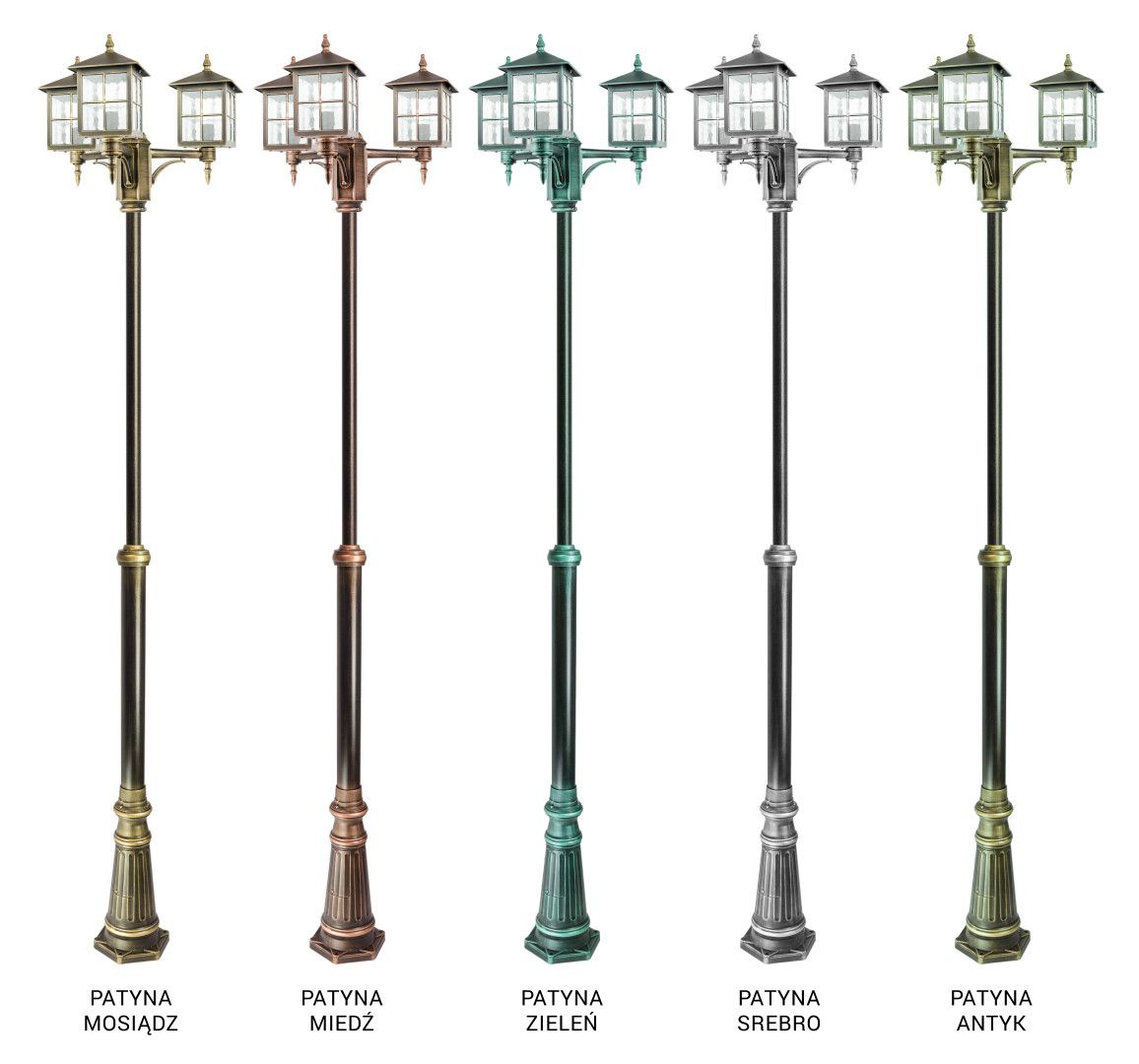 Lampy serii Wenecja dostępne są w sześciu wariantach kolorystycznych. Podstawowy kolor to czarny, a dodatkowe opcje to patyny: mosiądz, srebro, miedź, zieleń i antyk. Patyny są zabezpieczone wysokiej jakości lakierem bezbarwnym, co dodatkowo podkreśla ich elegancję i trwałość. Elegancka lampa masztowa Wenecja OGMWN 3 KW to doskonały wybór dla miłośników klasycznego stylu. Dzięki wysokiej jakości wykonania, regulowanej wysokości i możliwości dostosowania źródeł światła, lampa ta sprosta oczekiwaniom nawet najbardziej wymagających użytkowników, tworząc przy tym niepowtarzalny klimat w każdej przestrzeni.